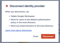- It's not possible to disconnect the Google identity provider and any attempts will display this modal - leaving the org. admin blocked: