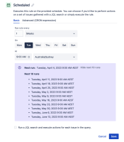 Currently our scheduled rule times run on a best attempt basis given the asynchronous nature of our queue along with other factors such as having a number of other rules queued to execute, the priority of scheduled execution vs events, large JQL search being used, and scheduling mechanism working in a best attempt fashion.