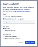 - From the Export users to CSV window, select Users from selected groups only and add the Group(s) you want to export