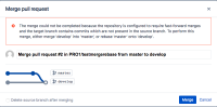 - Try to merge the pull request – the pull request will fail to merge due to the repo is configured to require fast-forward merges and the target branch contains commits which are not present in the source branch.