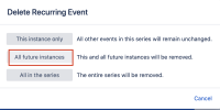 - Delete event in Team Calendar with option all future instances. For this step, delete the first occurrence of the event so when you remove the event and its future instances the whole event is removed.