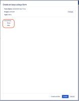 - Create the Jira issue by either not selecting show neither hide, or by selecting "hide"