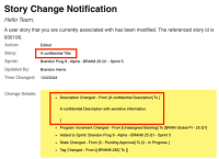 Jira Align email notifications are hard-coded to include work item field values such as the Title and Description (when updated) which may contain sensitive or confidential data.