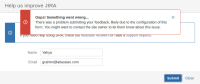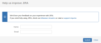 2. A popup window (Help us improve JIRA) will appear where there are fields for Name and Email address, but there is no field for feedback description/details