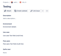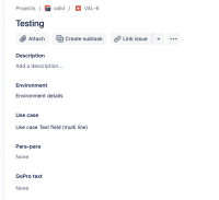 In the below example we can see when an issue was created by Create linked issue  (VAL-6) a Text Field (multi-line) "Para-para" was not pre-filed whereas a Text Field (multi-line) "Use case" was pre-filled.