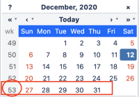 An incorrect week number is shown in JIRA's date picker control. The problem occurs because Jira marked the same week as last week of year Y and first week of year Y+1.