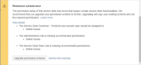 A modal popup is displayed indicating there is an issue with the Service Desk projects Permission Scheme and offers to resolve the issue