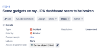 - Open the object details (URL <baseURL>/secure/insight/assets/ITAM-1) and open the Connected tickets tab