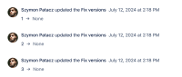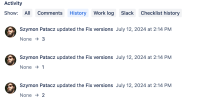 - if the Fix Version/s field contains 1 value and a 2nd value is added to it, the "previous value" column will show an empty value